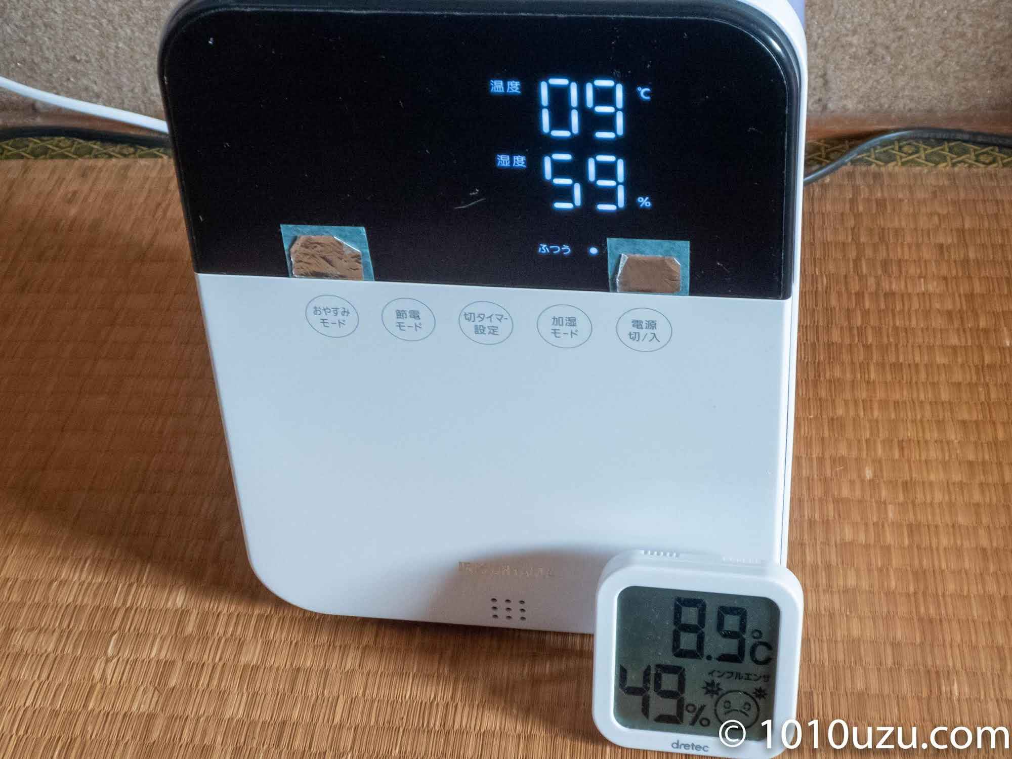 しかし 2021 年の秋に加湿器をセットしてみると湿度の表示が明らかに高いのです。ドリテックの温湿度計と並べてみると 10 % 程度の差があります。モードをふつうに設定した場合 60 % に達すると加湿をやめ 55 % に下がると加湿を再開するので、湿度が 50 % 後半になりとても便利でした。しかし内蔵湿度センサーが正しい値を取れなくなったのでふつうモードで稼働して 50 % 程度です。湿度が低いからか去年と同じ室温にしても息子が寒いといいます。