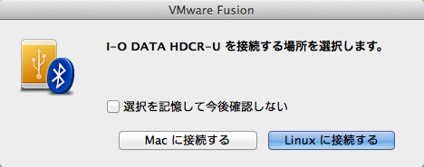 VMware で Ubuntu を起ち上げた状態で Mac に Regza の外付け HDD を接続すると以下のようなポップアップが出て、 Mac に接続するか Linux に接続するか聞かれます。 Linux をクリックします。
