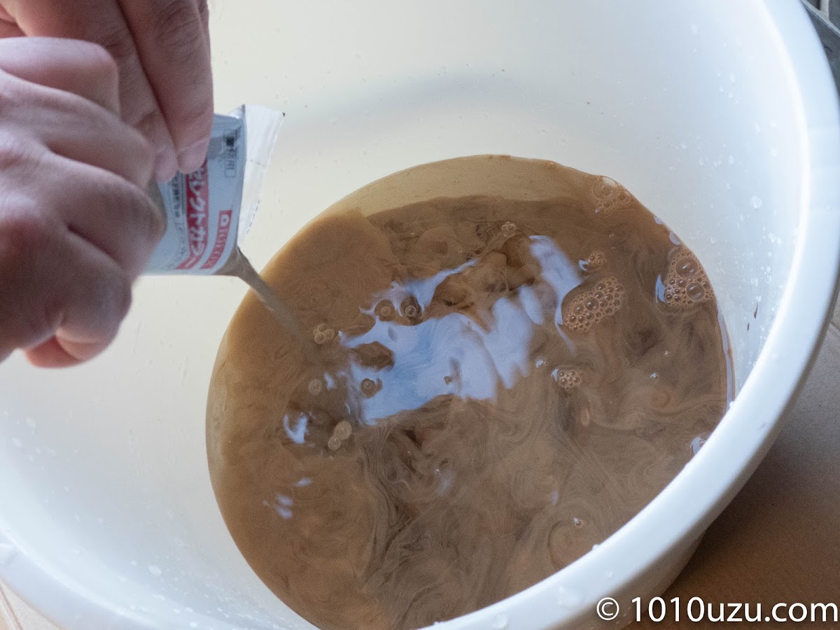 分量の 8 割 (2.8 L) の水を入れ着色剤を入れてかき混ぜます。リシンマザールでかき混ぜるように書いてありますがおたまでかき混ぜました。