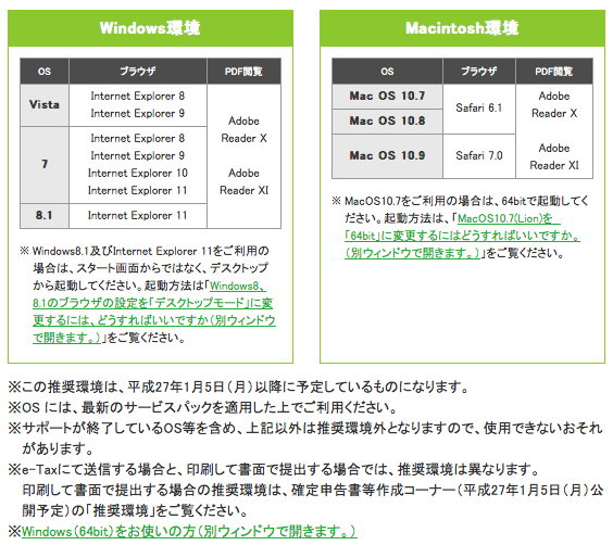 平成 26 年分は Mac では Mac OS X Lion (10.7) 、 Mountain Lion (10.8) 、 Mavericks (10.9) の 3 つのバージョンから e-tax できるようです。最新 OS の 10.10 Yosemite は非推奨のようです。また Snow Leopard (10.6) は推奨環境から外れています。