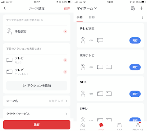 その他テレビのリモコンの細かいボタンも SwitchBot の手動実行のシーンとして登録すると、デバイスとして Alexa に認識されます。いちいちシーンに登録しないといけないのは Alexa 側からは SwitchBot にどんなボタンがあるかわからないからです。例えば SwitchBot で「地デジ」→「 1 」を「東海テレビ」としてシーン登録すると、 Alexa に「東海テレビ」というデバイスで認識され、「アレクサ、東海テレビつけて」というと選局してくれます。