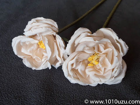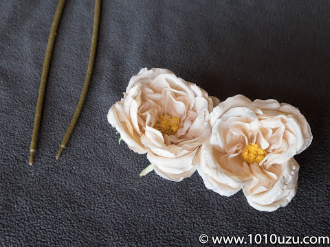 ただ刺しただけでは花びらを固定することができないので、オーガンジーのリボンを 6 cm くらいに切ってくるくると巻いてものを、花の根元でワイヤーを二股に分けたところに挟み、ワイヤーをねじって止めます。