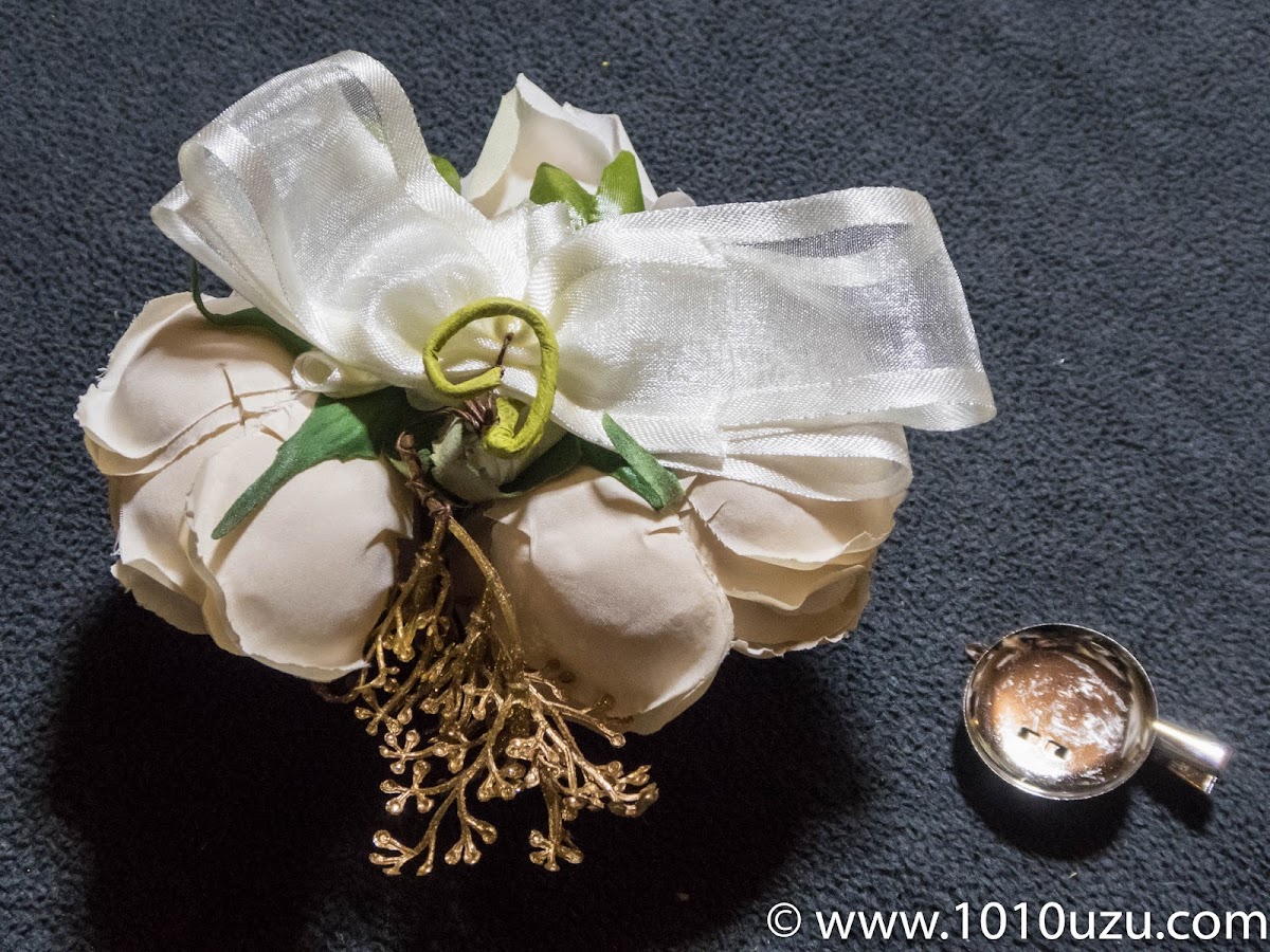 こんな感じで花の根本が目立たなくなりました。写真に撮り忘れましたが、 V の字にリボンを折って、下の部分をワイヤーでねじって固定して、それをコサージュのリボンと造花の間に入れてワイヤーを一周回して適当にねじって固定しました。余ったワイヤーは切り取って先端が洋服などに引っかからないように内側に丸めました。