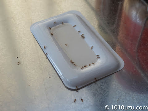 これをアリが出てきて困っているところに置いておくと、下の写真のようにアリが薬液を吸って巣に持ち帰るので巣ごと一網打尽にできるのです。アリの巣コロリとは比較にならないくらい効きます。ただ子供やペットが舐めないように注意しなければなりません。専用容器つきのものも売っているようです。