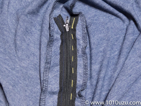 ファスナーの開き止まりを 10 cm ほどニット用のミシン糸とミシン針で縫います。開きは 65 cm としました。