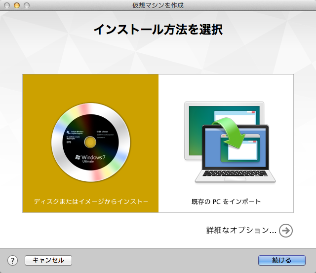 VMware Fusion の「ファイル」→「新規」→「ディスクまたはイメージディスクからインストール」を選択。