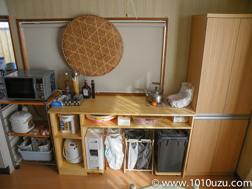 カウンター下には燃えるゴミ、缶、ビン、ペットボトルの資源ごみのゴミ箱を設置。床にダンボールに入って置かれていたジャガイモ、タマネギなどの常温保存野菜は電子レンジ下のカゴに移動しました。このカゴは水切りカゴなので、通気性もよく常温保管野菜にはうってつけだと思います。