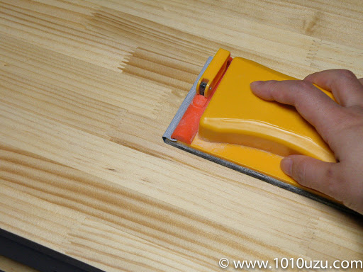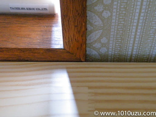 それからキッチンカウンターをどう収めるのか夫と話し合ったのですが、方法は 2 つ。 1 つ目はカンナでキッチンカウンターの底面を削り収める方法。 2 つ目は窓枠をノミで削り収める方法。 1 つ目が王道なので、カンナの刃を研ぎ、端材にカンナをかけてみたのですが、カンナは集成材が苦手みたいでうまく削れませんでした。なので 2 つ目の窓枠を削る方法をとることにしました。