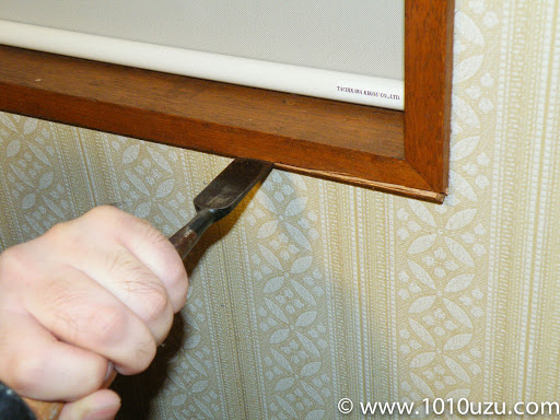 ノミも切れなかったので、夫が研いでくれました。キッチンカウンターと干渉している部分を鉛筆でケガき、ノミで削っていきます。