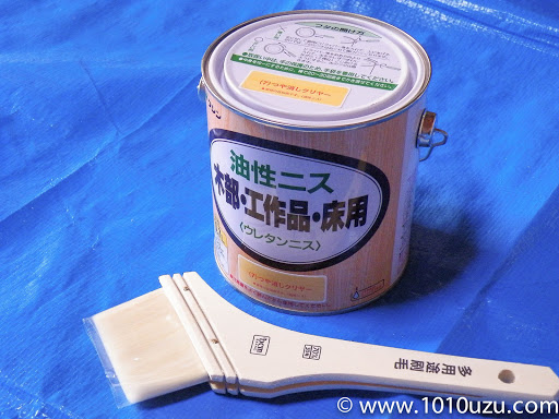 今回塗る塗料はこちら。油性のクリアのつや消しのニスです。再度天板だけ 240 番の紙やすりで磨いて塗装を始めました。和室で塗装をしたので、ブルーシートを敷き、その上に新聞紙ときれいな紙を敷きました。