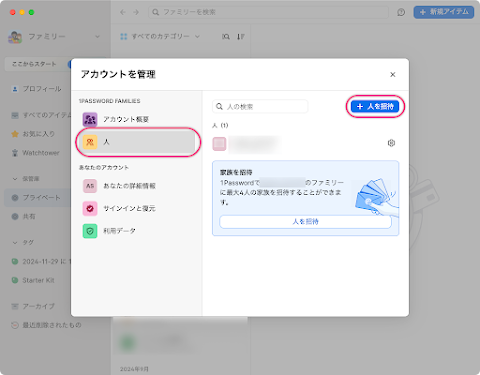 左のメニューの「人」を選択し、「 + 人を招待」をクリックします。