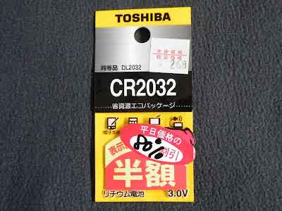 買ってきた電池は東芝の CR 2032 。商品の入れ替えのため 80 % off で 53 円でした。安いです。以前にも書きましたが、 Mac mini (Early 2009 : MB463J/A) の内蔵電池の型番は BR2032 (写真左)というものでもう生産されていません。同じ電圧で同じ形の CR2032 (写真右)が代用品のようです。両者の違いは使用温度範囲で、 BR が -30 ~ 80 ℃、 CR が -30 ~ 60 ℃のようです。