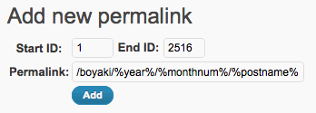 ということで、 Advanced Permalinks をインストール。管理画面の設定のパーマリンクに上部メニューが追加されて、その Posts というメニューを選択すると、 Start ID と End ID とパーマリンクの設定ができるので、今まで使っていたパーマリンクを設定しておいた。そしてデフォルトには、これから使うパーマリンクを設定。